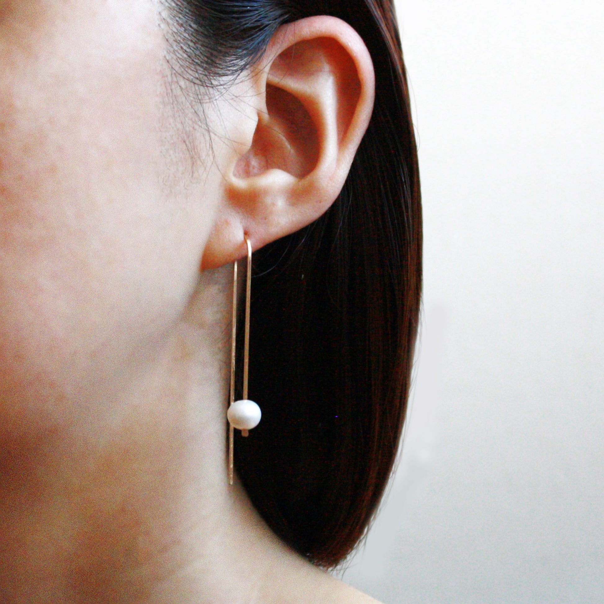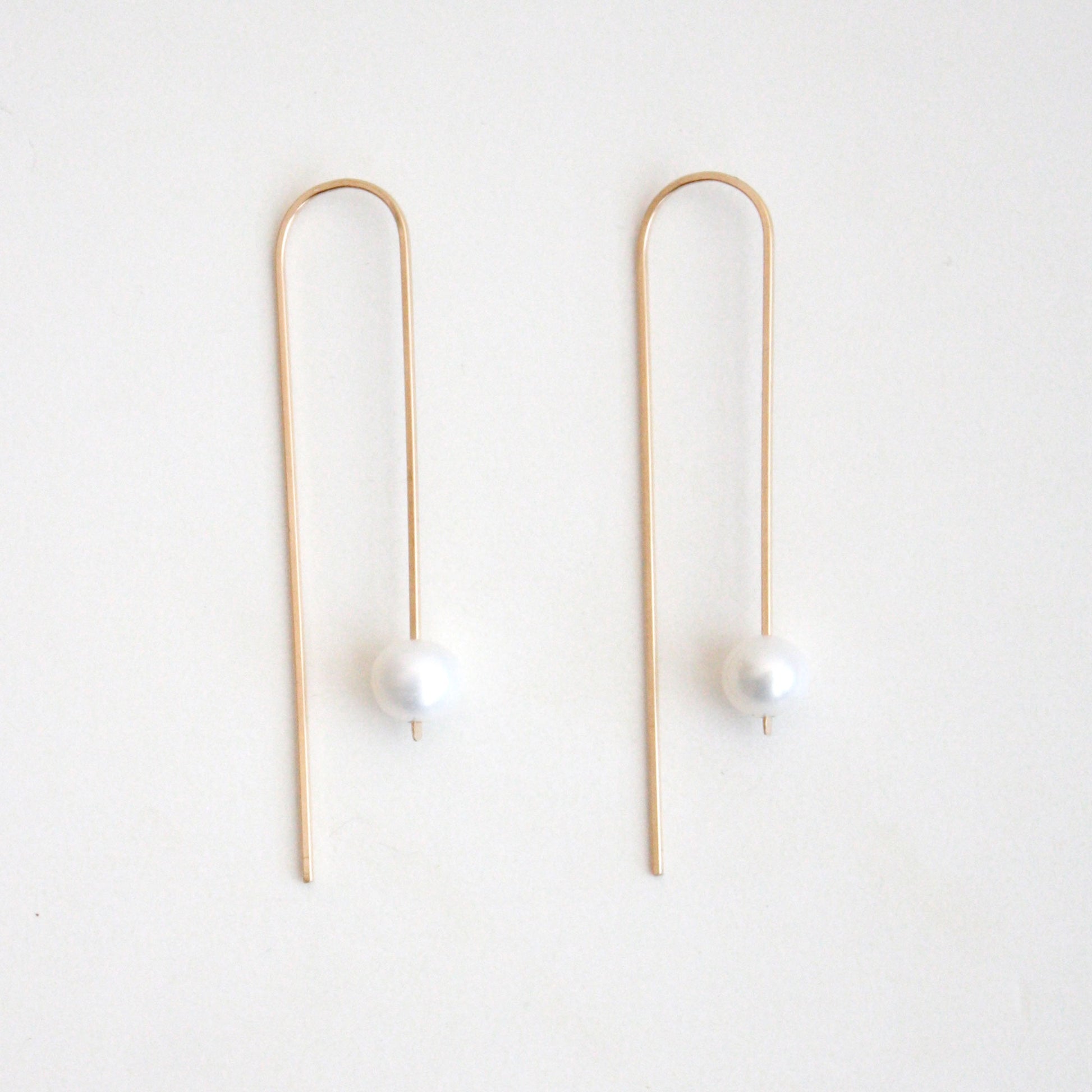 Long arc threader earrings with freshwater pearls, made out of hypoallergenic 14k gold filled wire that is nickel free. Freshwater pearls are the pearls created in freshwaters such as lakes and rivers. Because of thick layers of nacre coating, they are durable enough to be relatively sweat resistant and good for daily use.