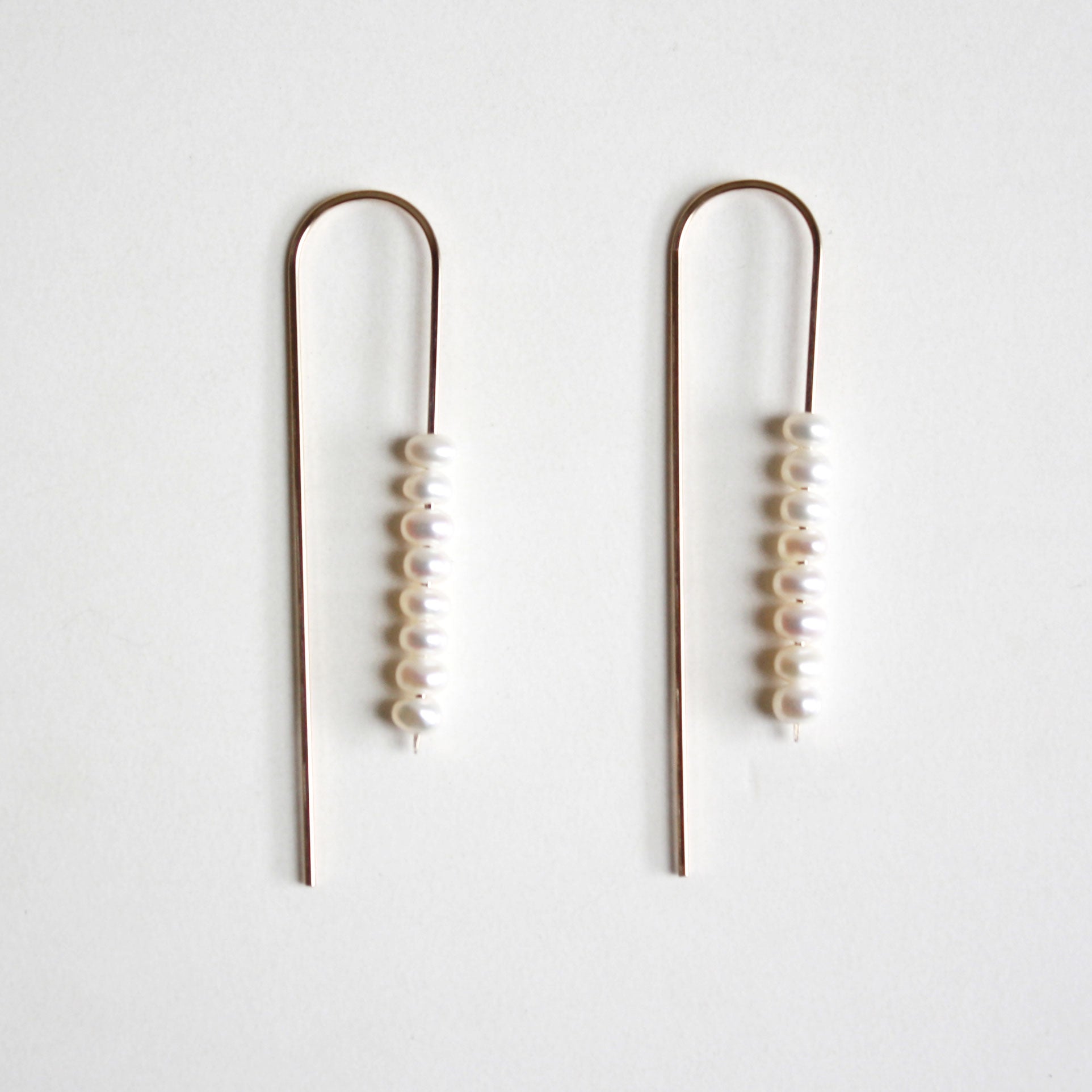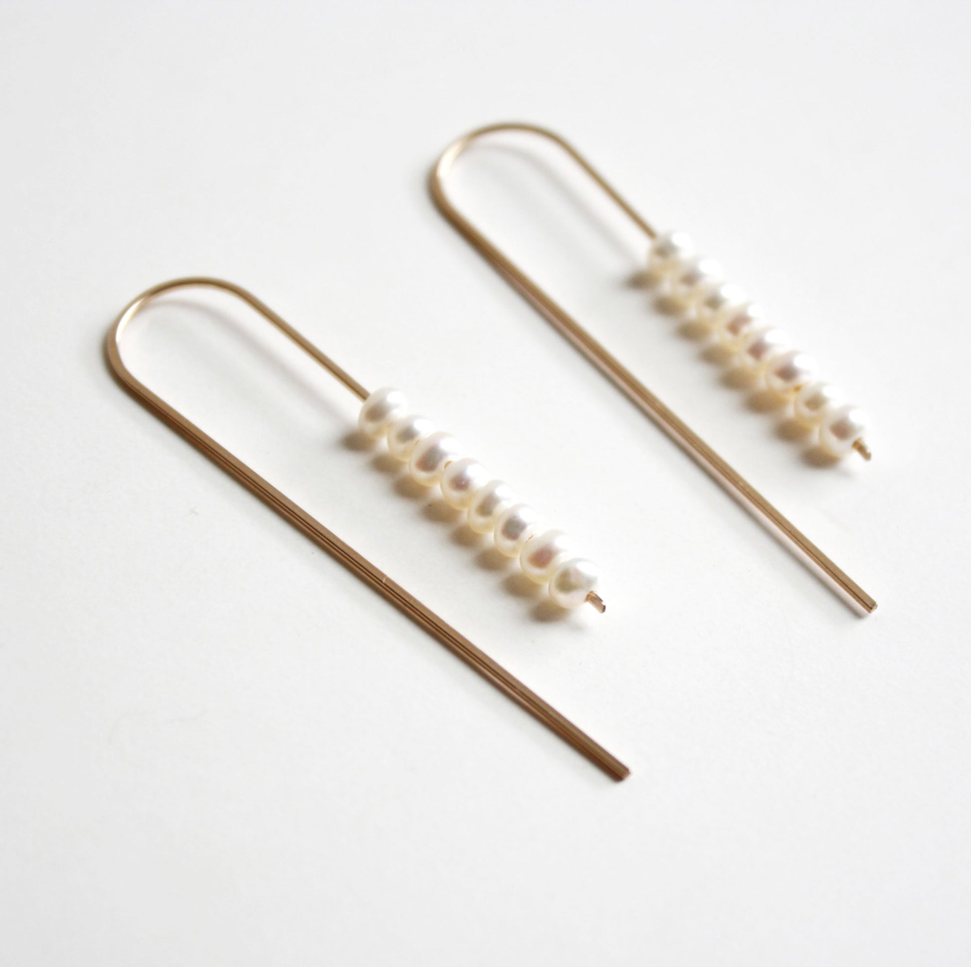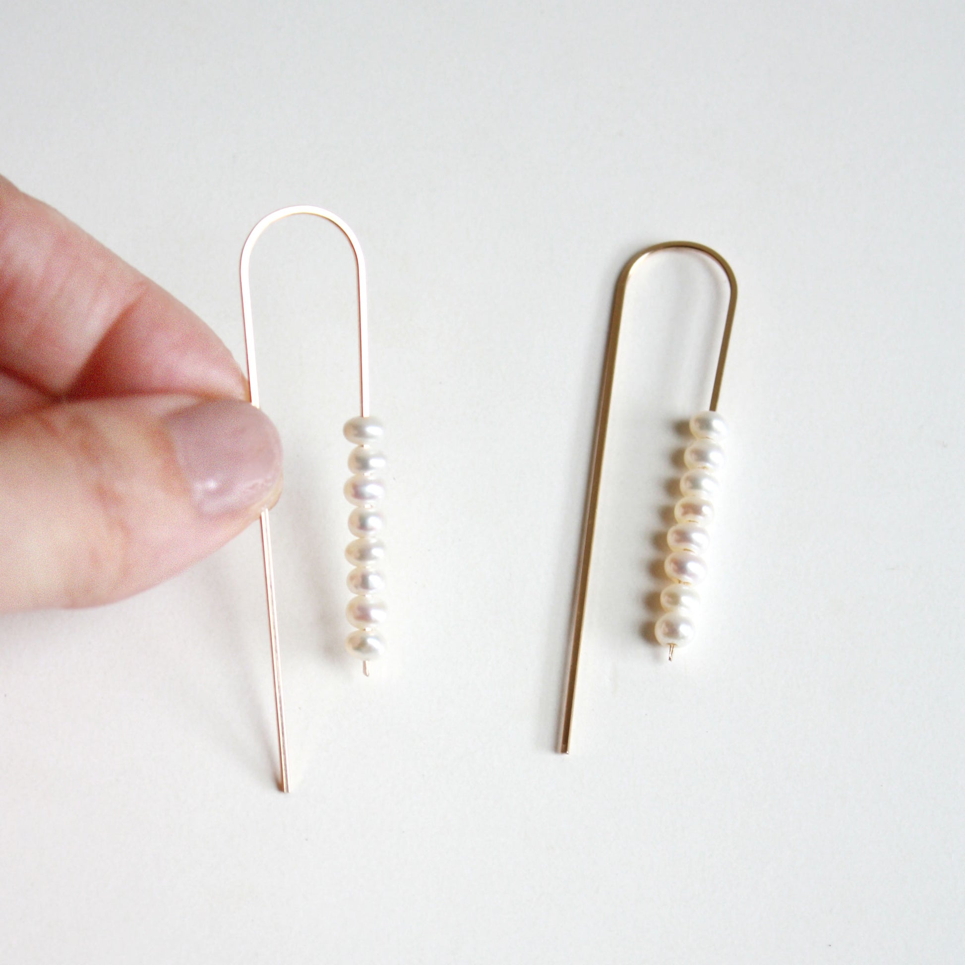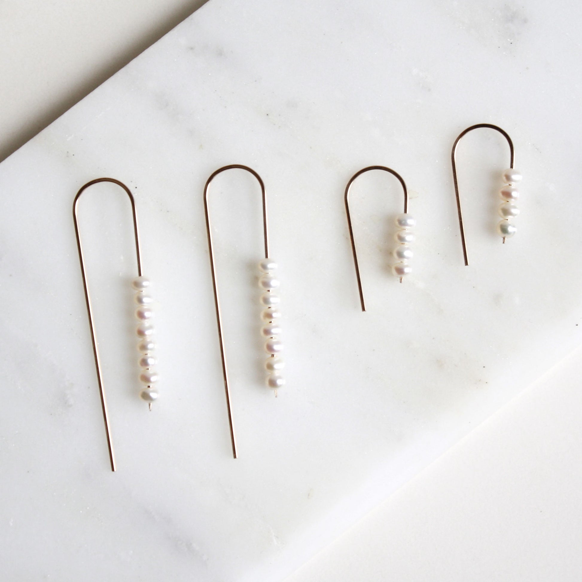 Long arc threader earrings with freshwater pearls, made out of hypoallergenic 14k gold filled wire that is nickel free. Freshwater pearls are the pearls created in freshwaters such as lakes and rivers. Because of thick layers of nacre coating, they are durable enough to be relatively sweat resistant and good for daily use.