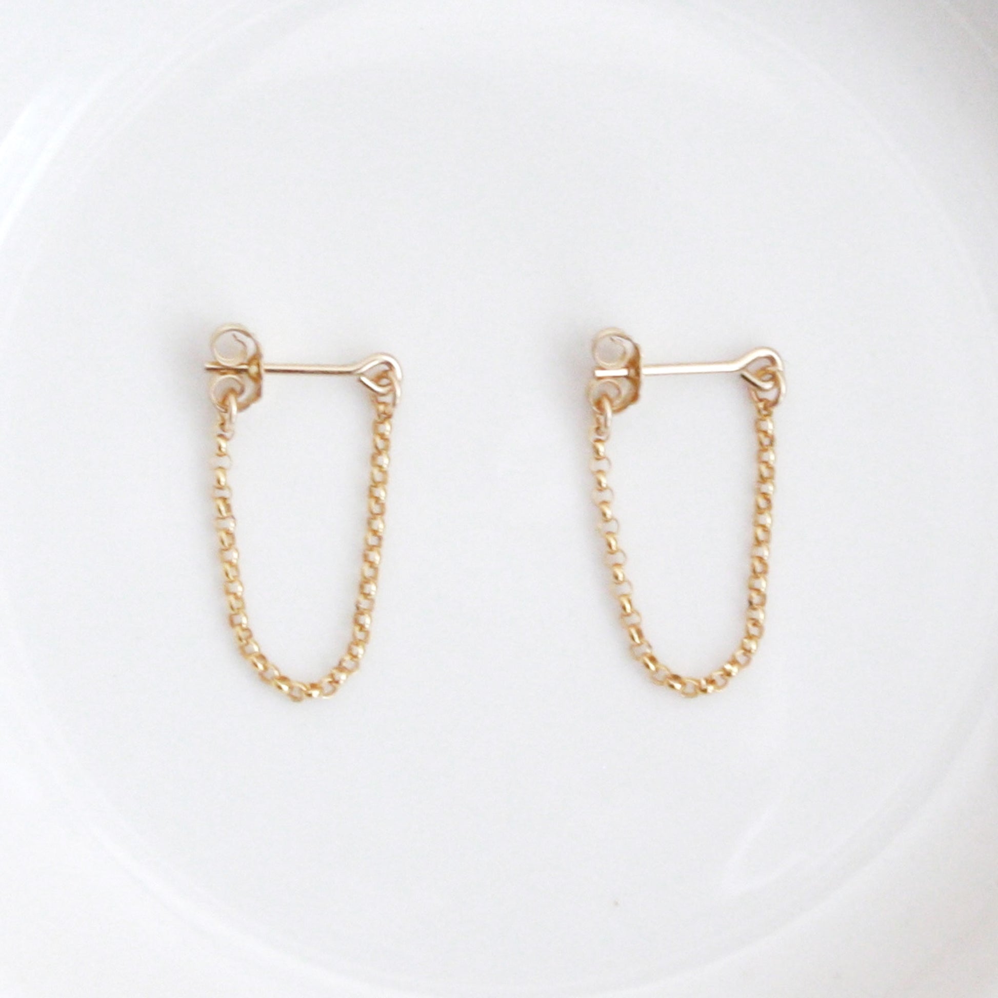 Dainty chain hoop stud earrings. They are so simple and minimal that they fit any outfit! Every single piece is handmade in New York so that a shape may be slightly different from each other. These earrings will be made for you after the order is placed.